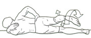 Lateral position, with the leg on the supporting surface bent slightly. The other leg, turned inwards with extended hip and knee joints and flexed ankle joint, is raised and lowered; the right hand stabilizes the pelvis.